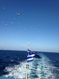 in the Aegean, is the sight of more shades of blue than you ever thought possible to see. The glistening dark indigo of deep water, the bright cobalt of the sky – even in January. We are followed closely by seagulls and the foaming white, wake of the boat cutting through the sea.