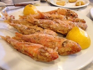 The taverniaris offers us a variety of different fish – small fresh cod, octopus, whitebait, to name a few. We settle on squid and a type of red-mullet called ‘koutsomoúres’ (‘flat-faced’). They are both served fried to perfection. The squid is soft and tender; the mullet so fresh that the bones can be gently pulled out by the tail. Our side dishes are a crisp cabbage and carrot salad,dressed with lemon juice and olive oil and fried potatoes, sprinkled with oregano. A small carafe of local white wine is the perfect accompaniment.
