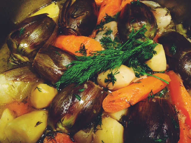 In Greece, there are many ways to cook artichokes. In the islands, the tiny, tiny early buds are eaten as street food – raw with salt. The slightly bigger ones can be braised with early, tender broad beans or peas. The sauce can sometimes be complemented with the addition of a few skinned, chopped tomatoes – but the best is the most simple; a little water, a little lemon juice and a significant amount of that essential ingredient – olive oil. With the addition of some fragrant chopped dill, this is one of the most elegant and most subtle of dishes.