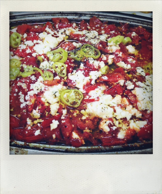In a frying pan, heat the olive oil and when hot, add the sliced peppers and gently fry for a few minutes. Add the garlic and the diced tomatoes. Add salt and pepper – go easy on the salt, as the feta is salty. Depending on which type of peppers you have used, you may have to add some dried chilli flakes. What you are trying to achieve is a warm spicy dish – hot enough to make it moreish, but not so hot it blows your socks off!