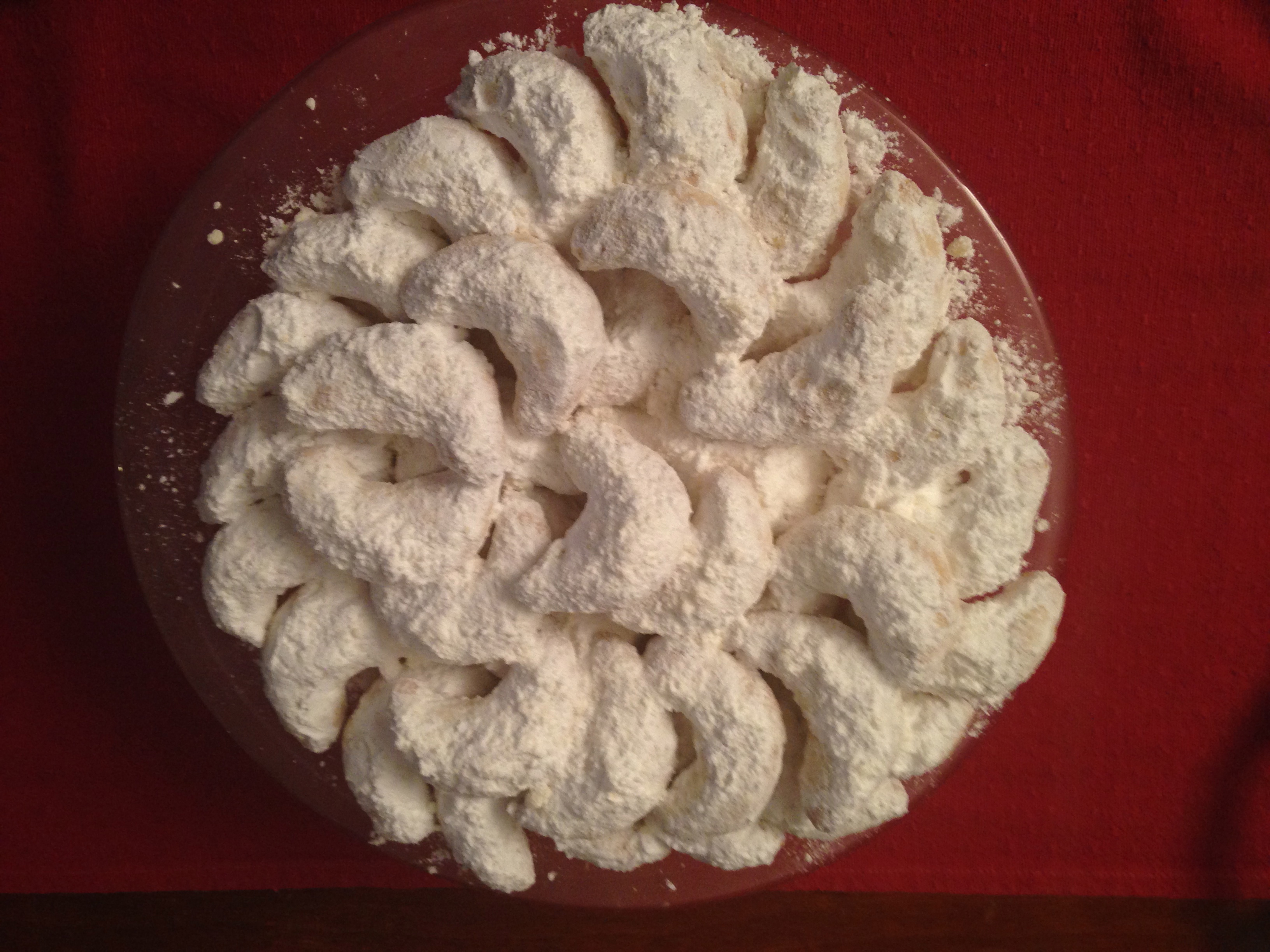 In every pastry shop or bakery and in every home there plates piled high with wonderful snowy mounds of kourabiédes – almond and rosewater flavoured biscuits dusted with heaps of icing sugar- and also golden melomakárona – this time honey-drenched biscuits flavoured with spices and walnuts.
