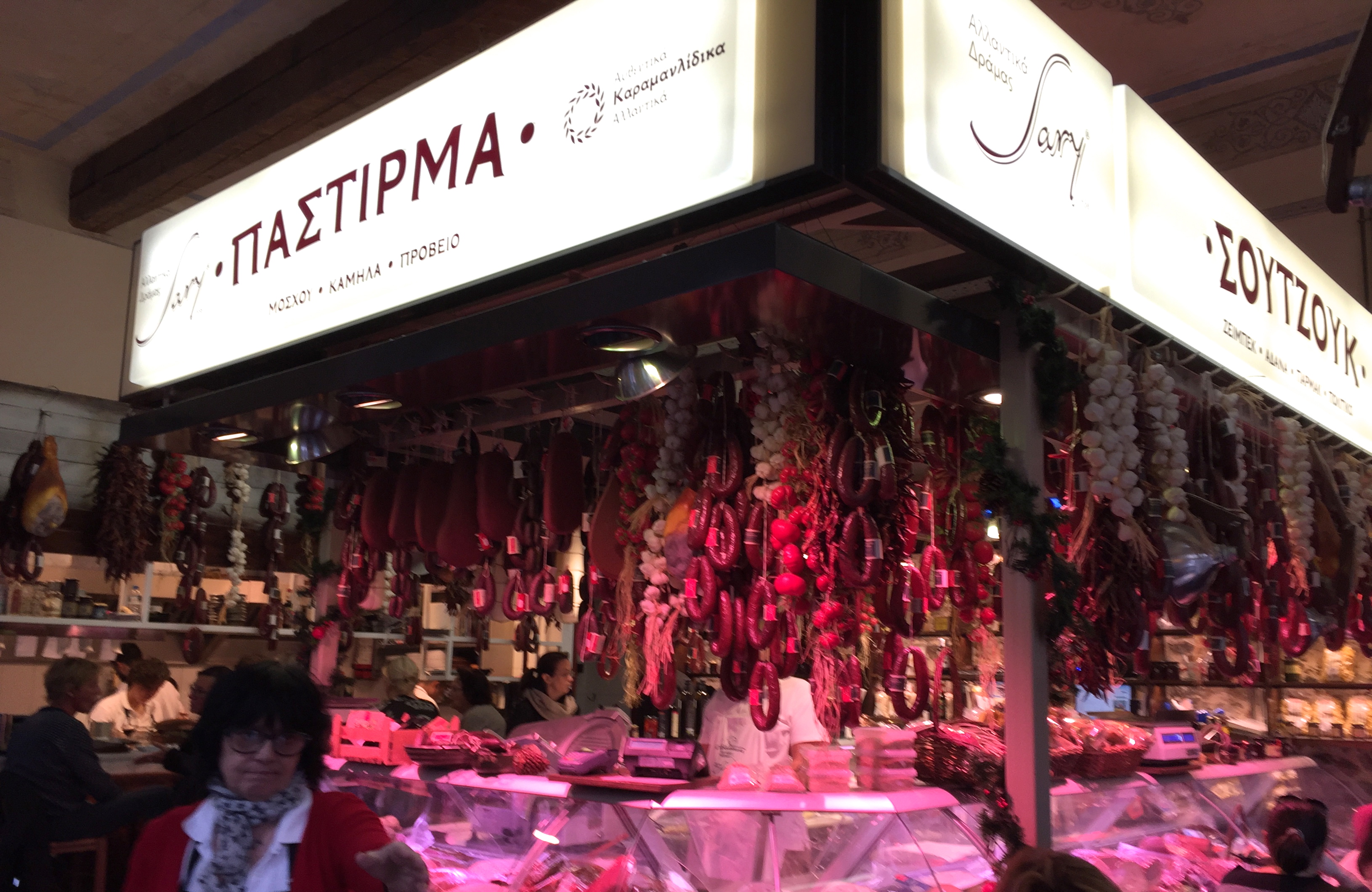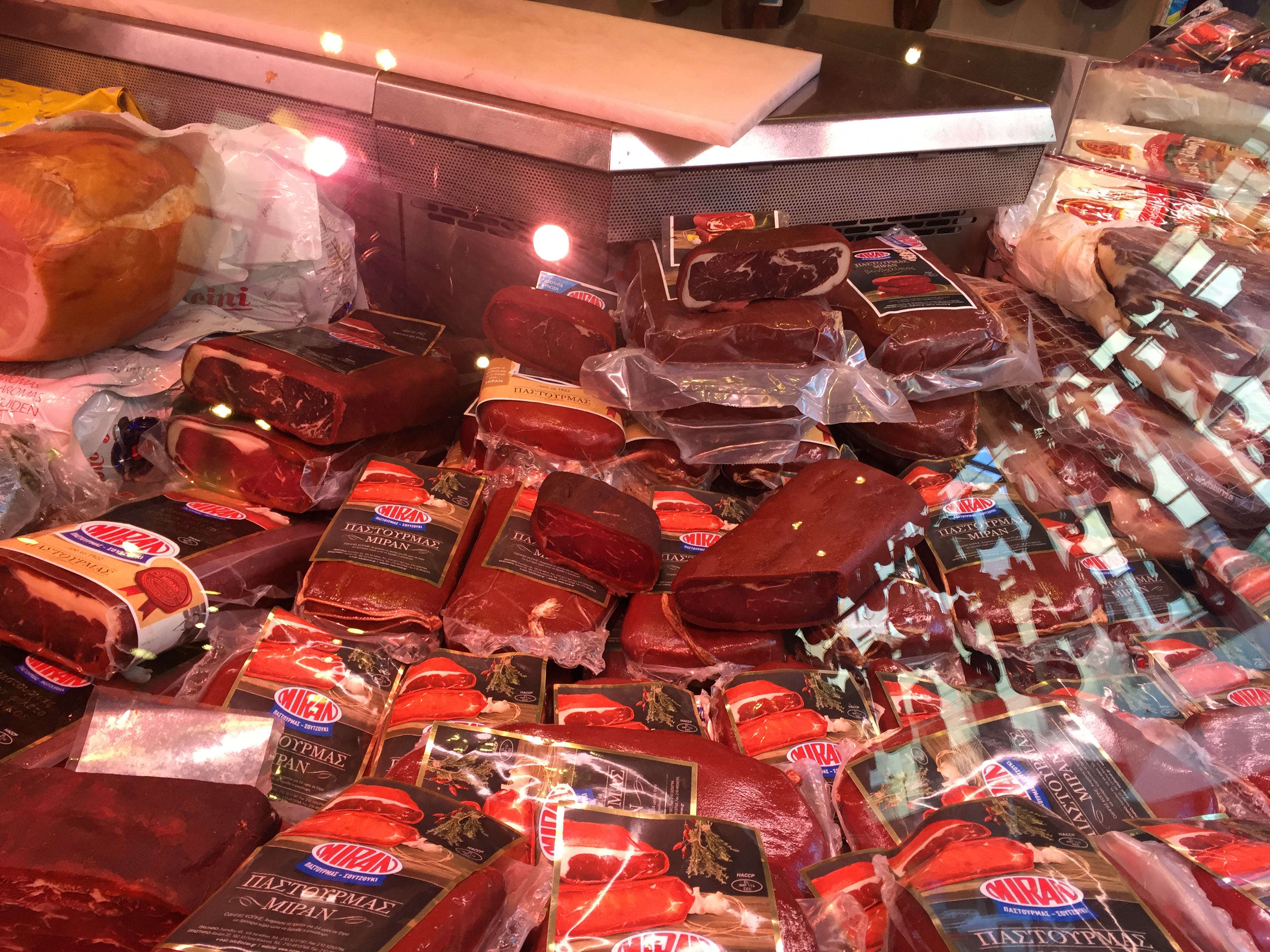 Pastourma is a salted, spiced and cured meat. These days it is usually made from beef but traditionally it was made from camel meat – today this is the most expensive pastourma. The other signature product, soutzouk, is an air-dried, spicy beef sausage.