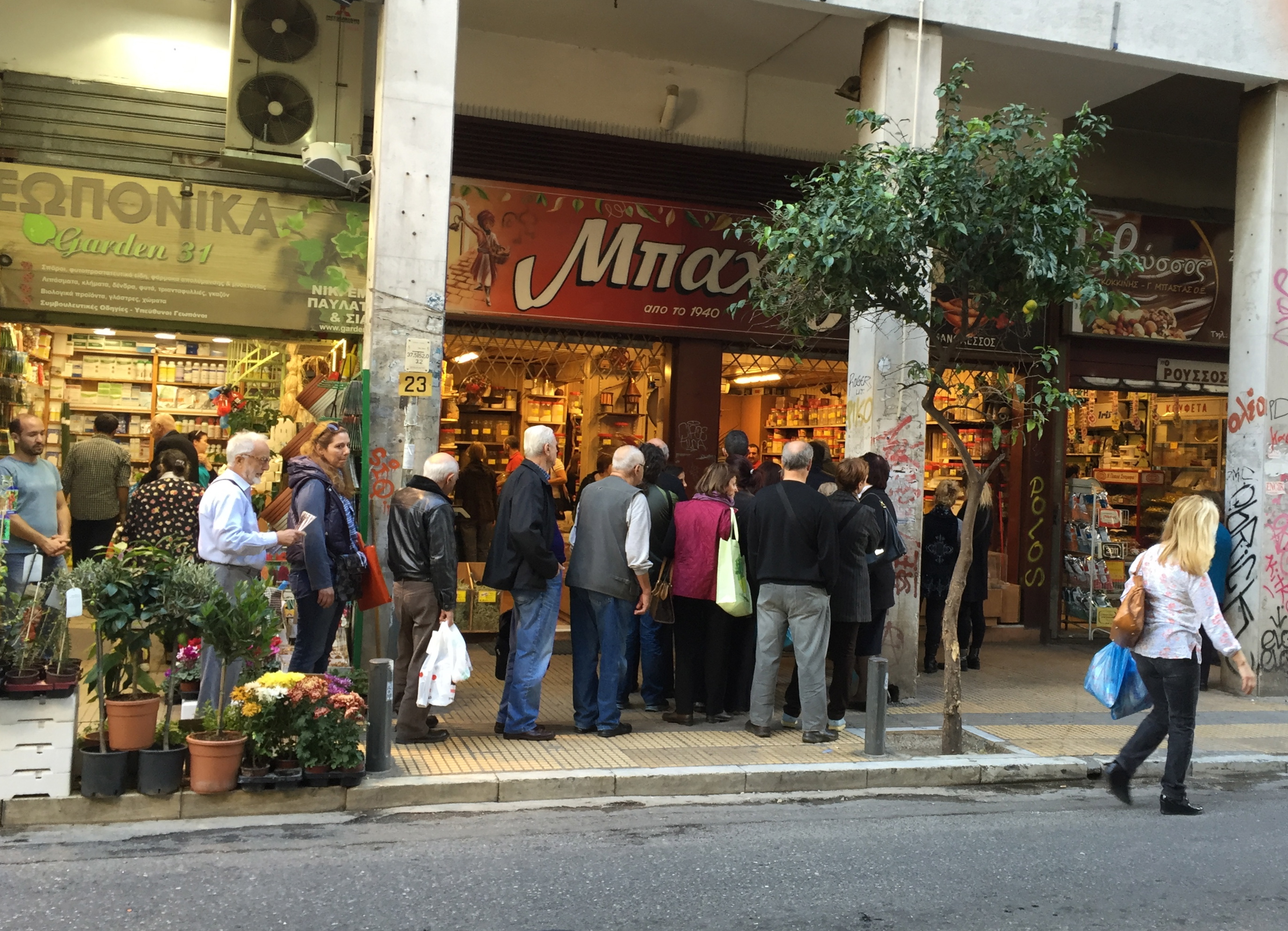There are some very famous shops here too. The first you come across is ‘Bahar’, at number thirty one – easily identified by the almost permanent queue outside. ‘Bahar’ has been supplying the people of Athens with spices, herbs, dried fruits, grains and pulses since 1940. They have moved with the times too; goji berries, dried cranberries and blueberries are now in the mix.This is the perfect place to pick up supplies of fragrant, Greek oregano and thyme.
