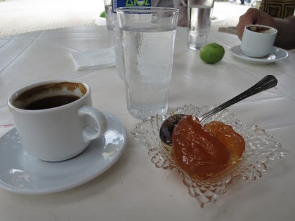 Up in the mountains a few kilometres away, the tiny village of Agia Paraskevi is totally charming. The air is heavy with the sent of fig and jasmine and, for the first time ever, I taste sweet, white mulberries picked straight from the tree. Agia Paraskevi has suffered the fate of many mountain villages – not enough people to maintain the numerous houses. The empty ones, however, provide a melancholy beauty to the place. Coffee is required and we sit at the village café along with a handful of locals. Needing something sweet too, we are offered no less than four types of traditional spoon-sweet, made by the owner herself. We ponder between cherry, orange and more but I plump for the one made from the fragrant Firiki apples from Pelion. It is firm and sweet, and slightly caramelised. It is another embodiment of meráki.