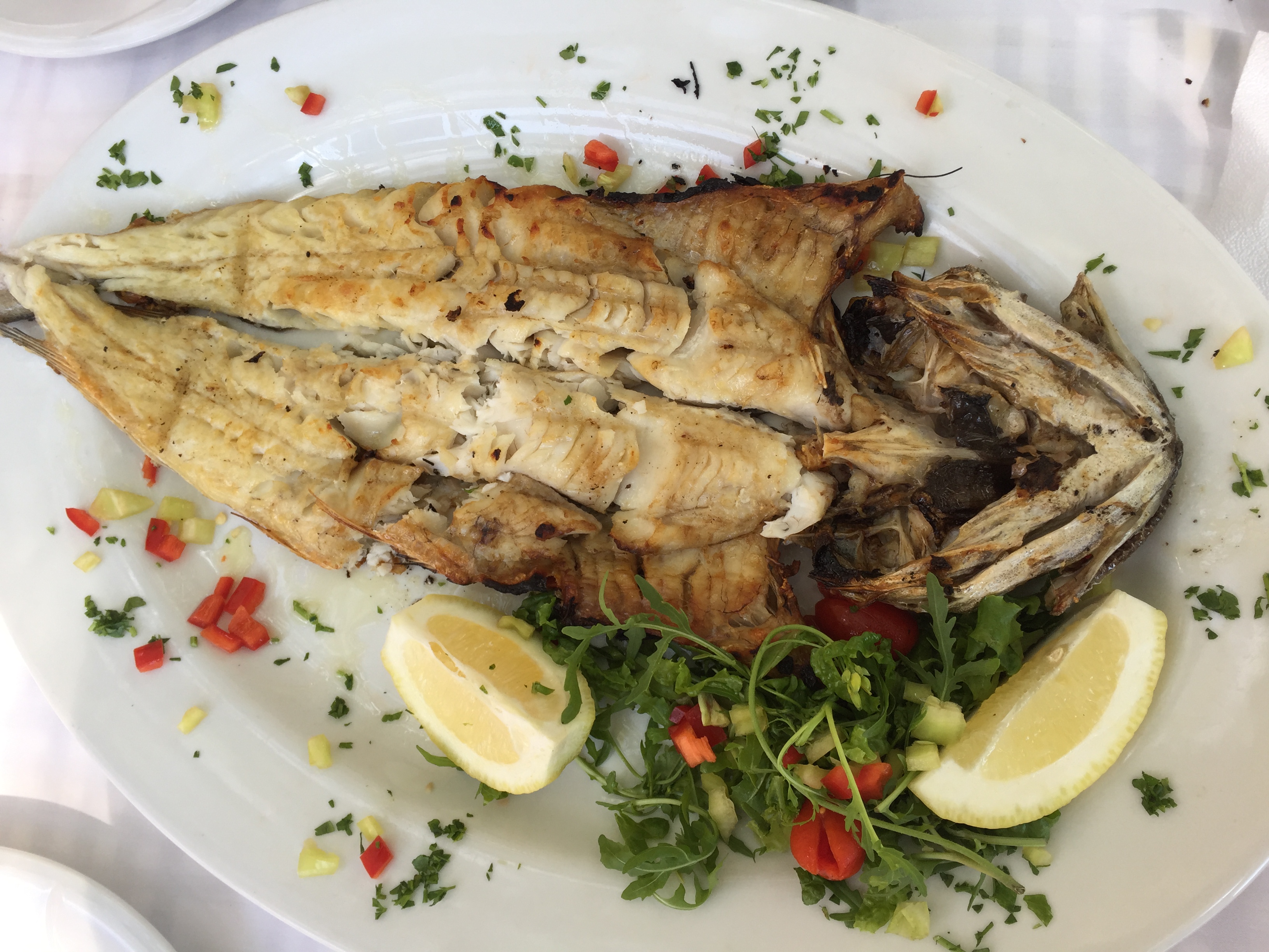Next comes a beautifully chargrilled and spatchcocked baby cod. Here, in Macedonia, this method of cooking fish is known, curiously, as ‘gouna’ or ‘fur coat’ – the only one I will ever be seen with, for sure! Everything is perfect – perfectly cooked and perfectly served by the husband and wife team that run this seaside taverna. This is meráki encapsulated – nothing less than perfect will do.
