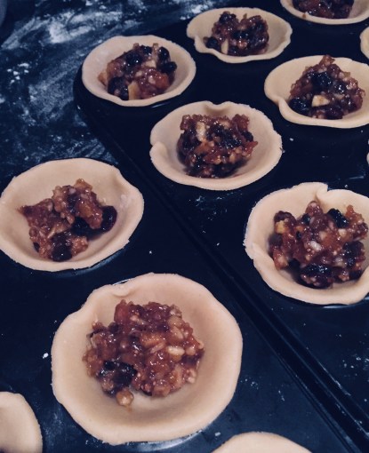 Line the patty tins with half the pastry discs and put a small spoonful of the mincemeat into each. Now use the rest of the discs as pie tops.