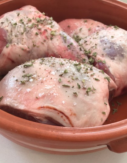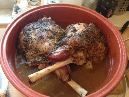 Put the casserole in the hot oven. Leave it to cook for 45 minutes at 200 degrees, then turn the oven down to 165 degrees and cook for about 2 hours or so – the lamb needs to be soft and falling off the bone. About halfway through this 2 hours of cooking time, carefully lift off the lid, just to see how the meat is cooking. There should always bee a fair amount of meat juices in the pan – if it is starting to look dry (it shouldn’t !) Add a little water to the pan, replace the lid and cook for the rest of the time. Obviously, every oven is different – I have said 165 degrees for most of the cooking, you may need to have it a bit hotter or cooler depending on your oven. Fortunately, with this method, you can check to see how it’s going.