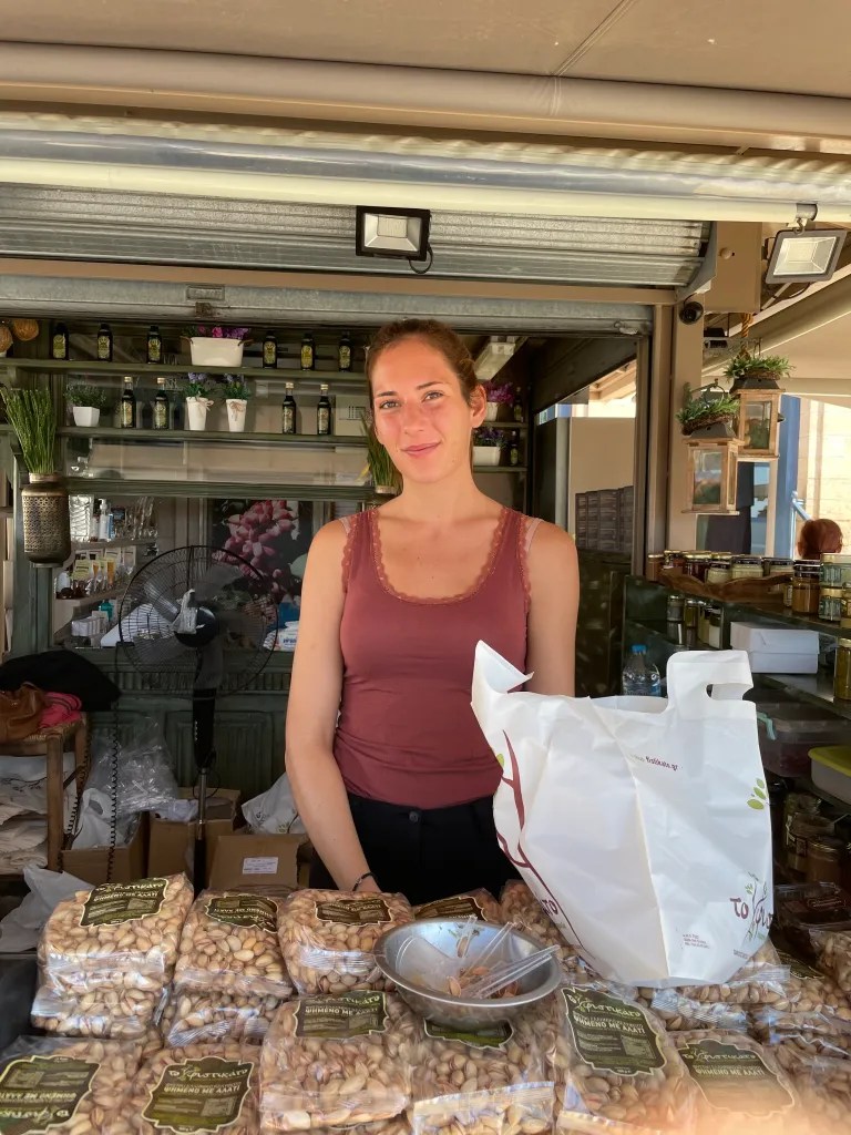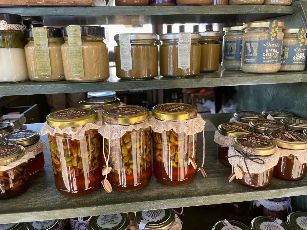 The main harbour is dominated by shops selling every type of pistachio product imaginable. I couldn’t resist the pistachio pesto and pistachio nut butter at To Fistakato. I do wish we’d had room to bring back some of the pistachio baklava – its colour of fine emeralds achieved purely from the amount of nuts used.