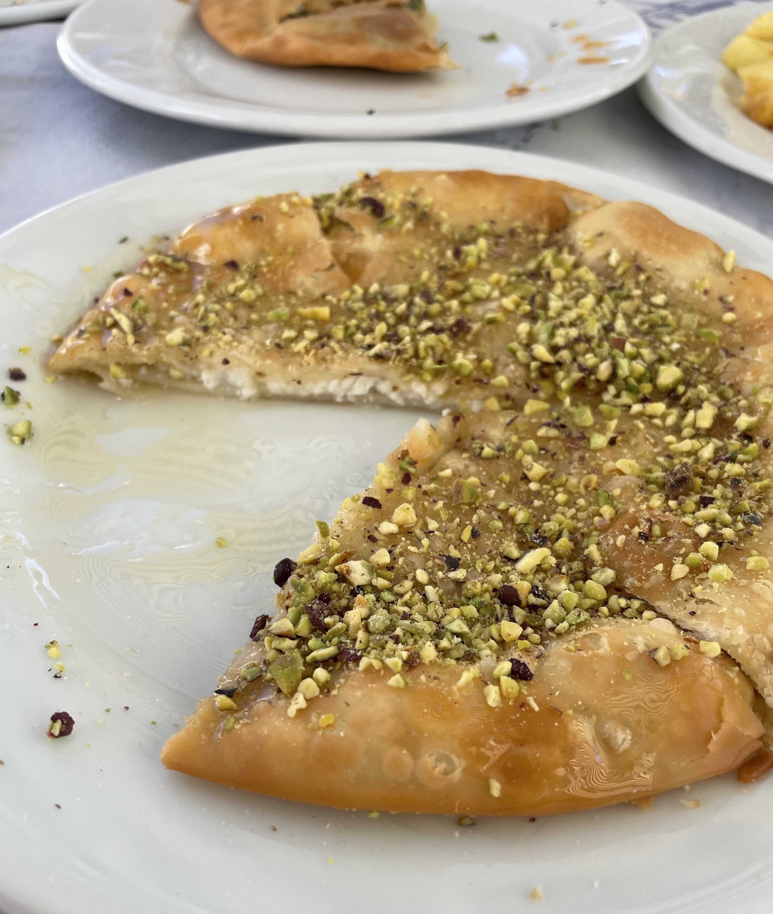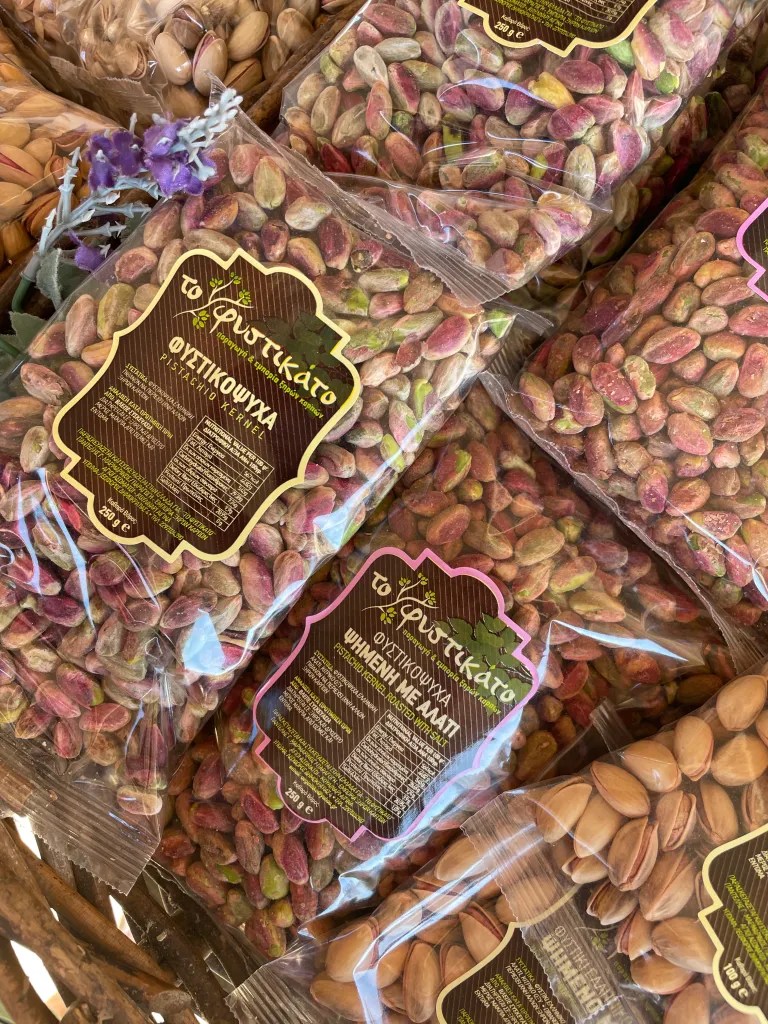 Unfortunately, we had just missed the 12th ‘Fistiki Fest’ – a food and cultural festival celebrating everything to do with pistachios – but in truth everyday is a bit of a ‘Fistiki Fest’ here. Obviously pistachios are used extensively in the local food, like our mizithropita at Remetzo. A salty, sweet cheese pie, drizzled with honey and a tourmaline-coloured crust of crushed pistachios.