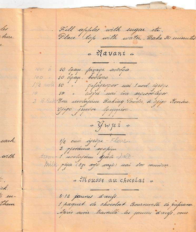 Sometime in 1930, the 20 year-old Miketta Papageorge bought a blue-covered ‘cahier’ an exercise book. I say ‘bought’, but perhaps it was even one left over from her not too distant school years. On the cover, with meticulous penmanship, she wrote, ‘de cuisine’. This was her recipe book.