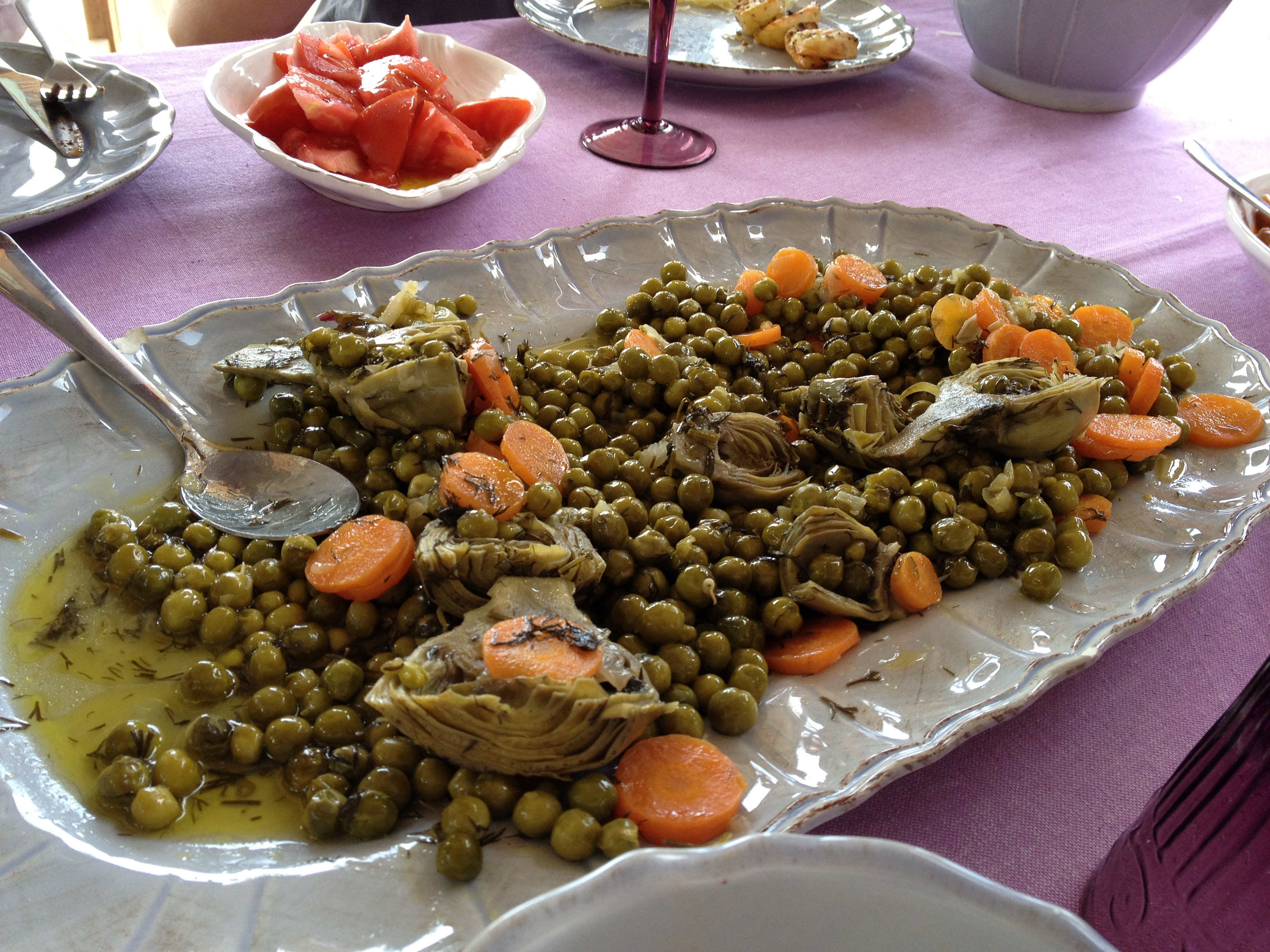 Artichokes have, at their core, a fibrous ‘choke’ that needs to be removed. In the big globe ones the ‘choke’ is quite tough, in the smaller varieties, the ‘choke’ is more like silky tufts. Cut the small artichokes in half lengthwise, exposing the ‘choke’ and scoop it out.