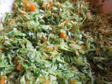 Next, one handful at a time, take the grated courgette/marrow and squeeze out as much liquid as you can. Add the squeezed, grated courgette/marrow to the chopped leeks and herbs.