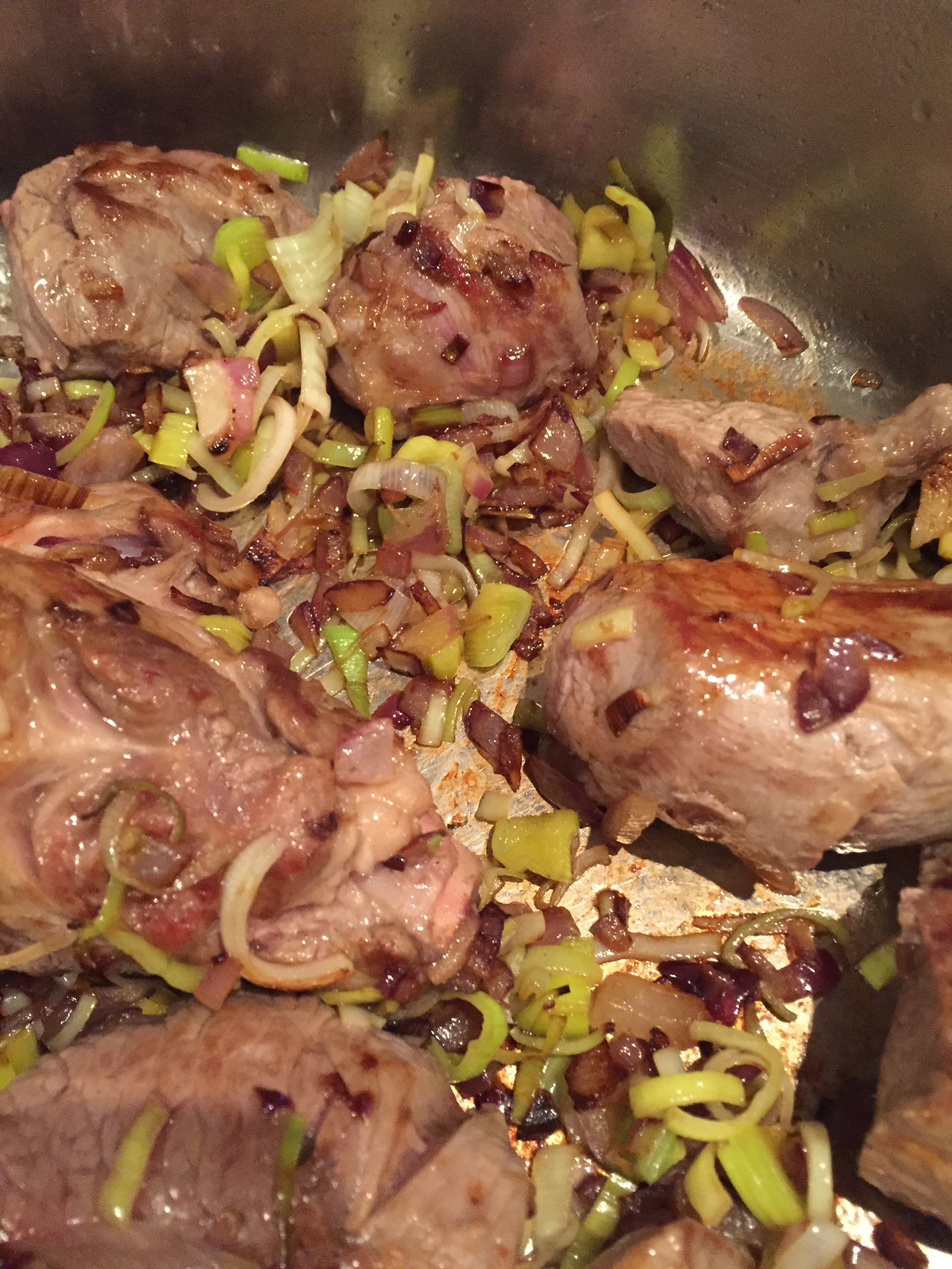 Add the chopped leek and onion to the casserole and soften in the oil. Return the meat to the pan and turn it in the softened leek and onion.
