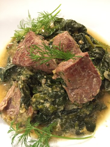 When the meat is cooked, add the chopped lettuce and/or spinach, the dill and parsley and allow to cook gently until the leaves have wilted. This takes about 15 – 20 minutes.