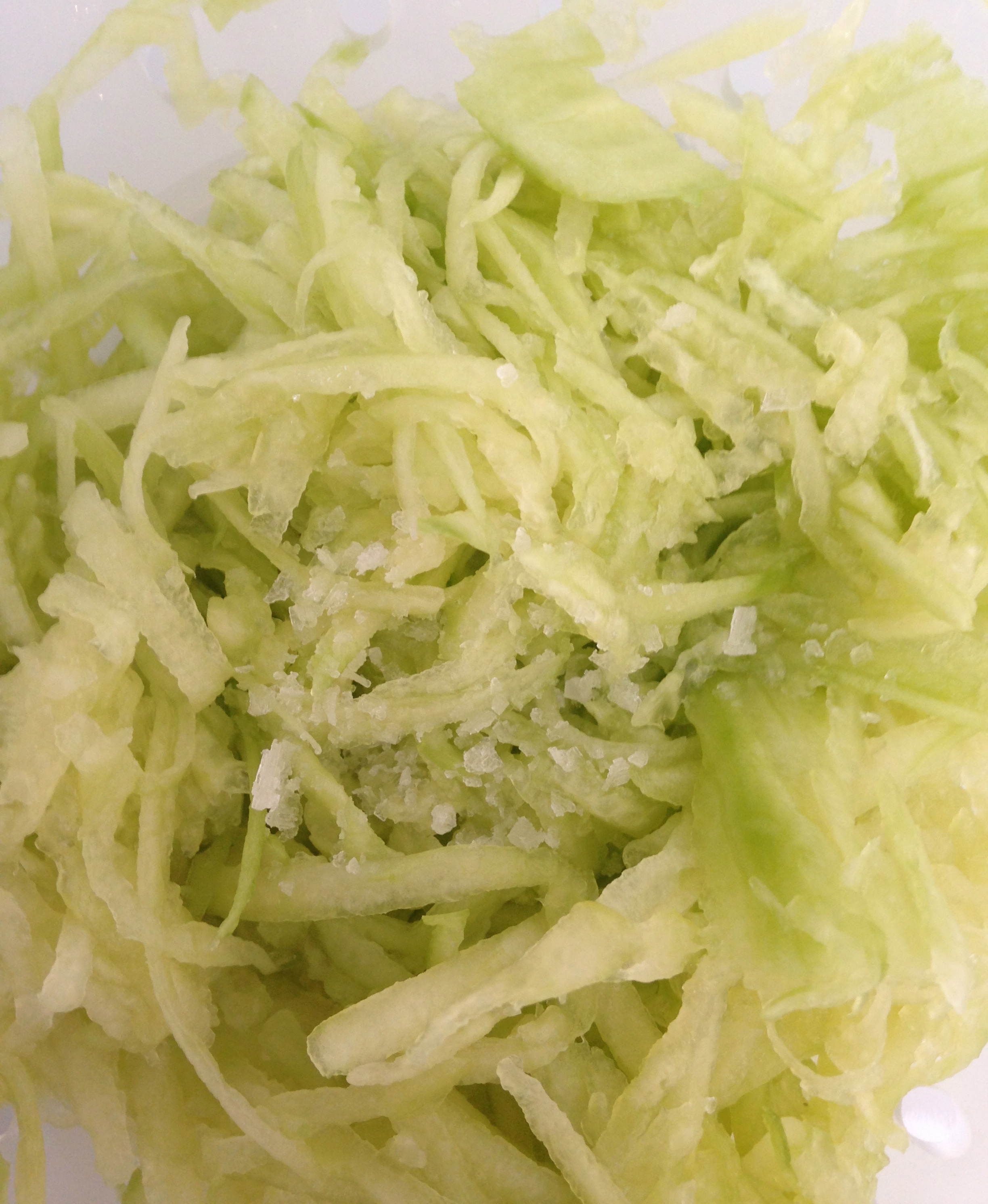 Next with a coarse grater, grate the cucumber into a colander. Sprinkle with a little salt and leave to one side for about 30 minutes.