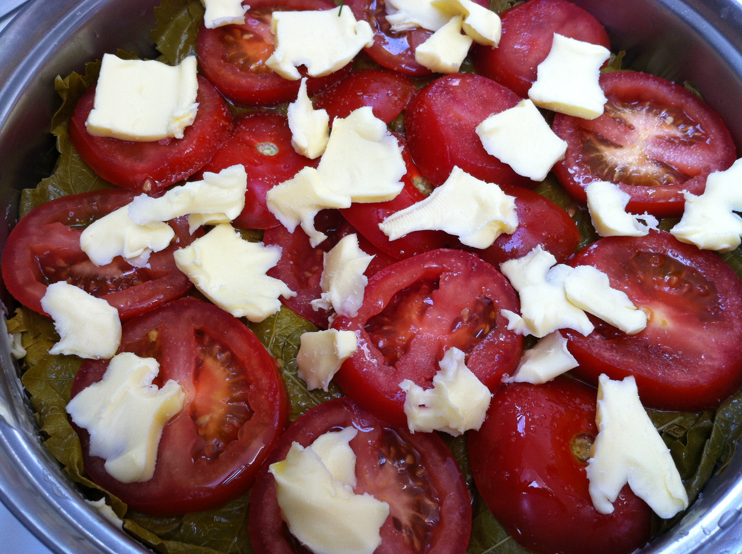 Cover the last layer with leaves. On top put the sliced tomatoes and dot with the remaining butter.