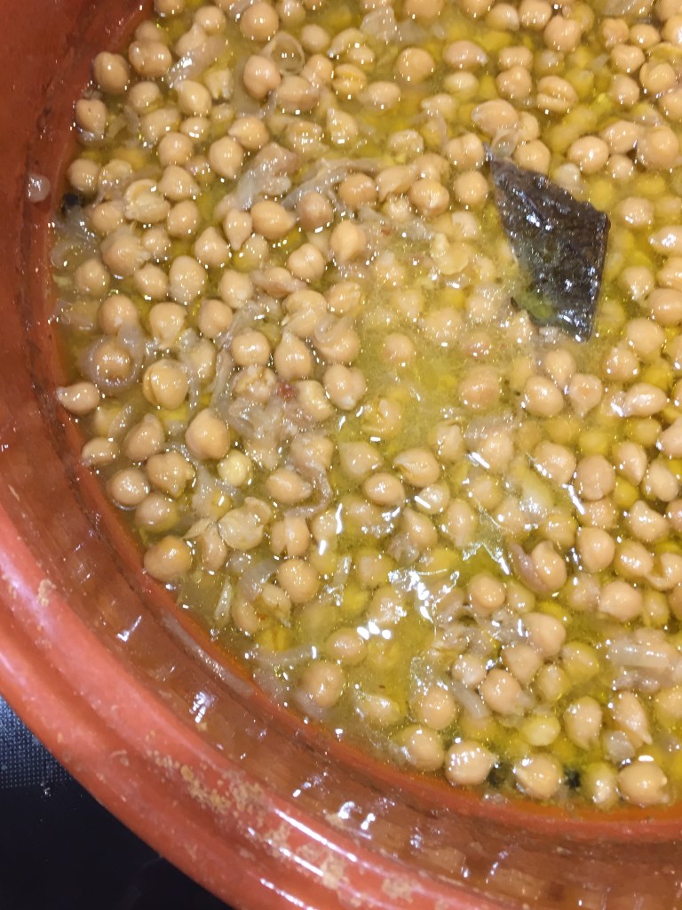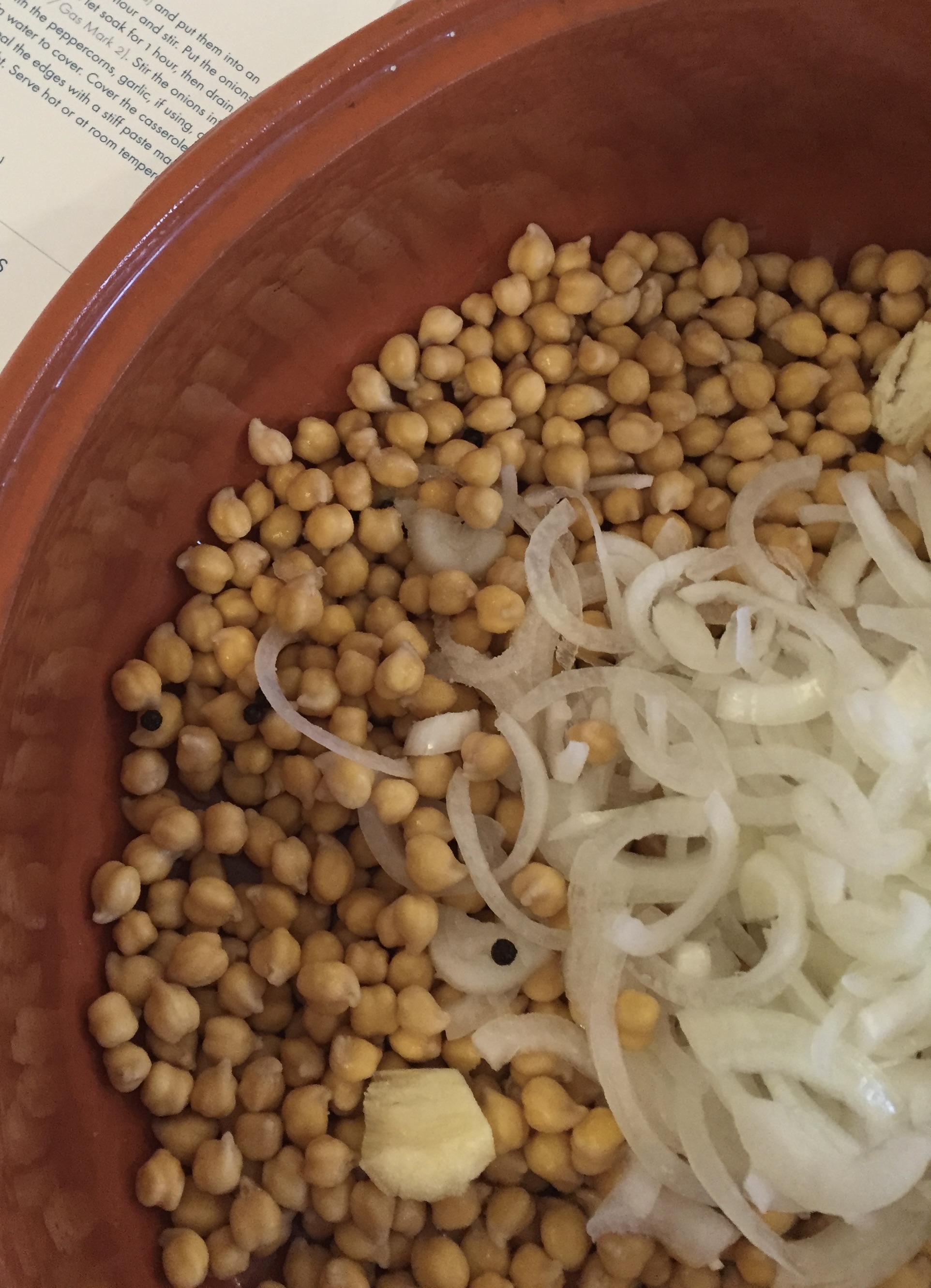 Now drain the onions and add to the chickpeas with the peppercorns and garlic, if using. Season with salt and then add enough water to cover.