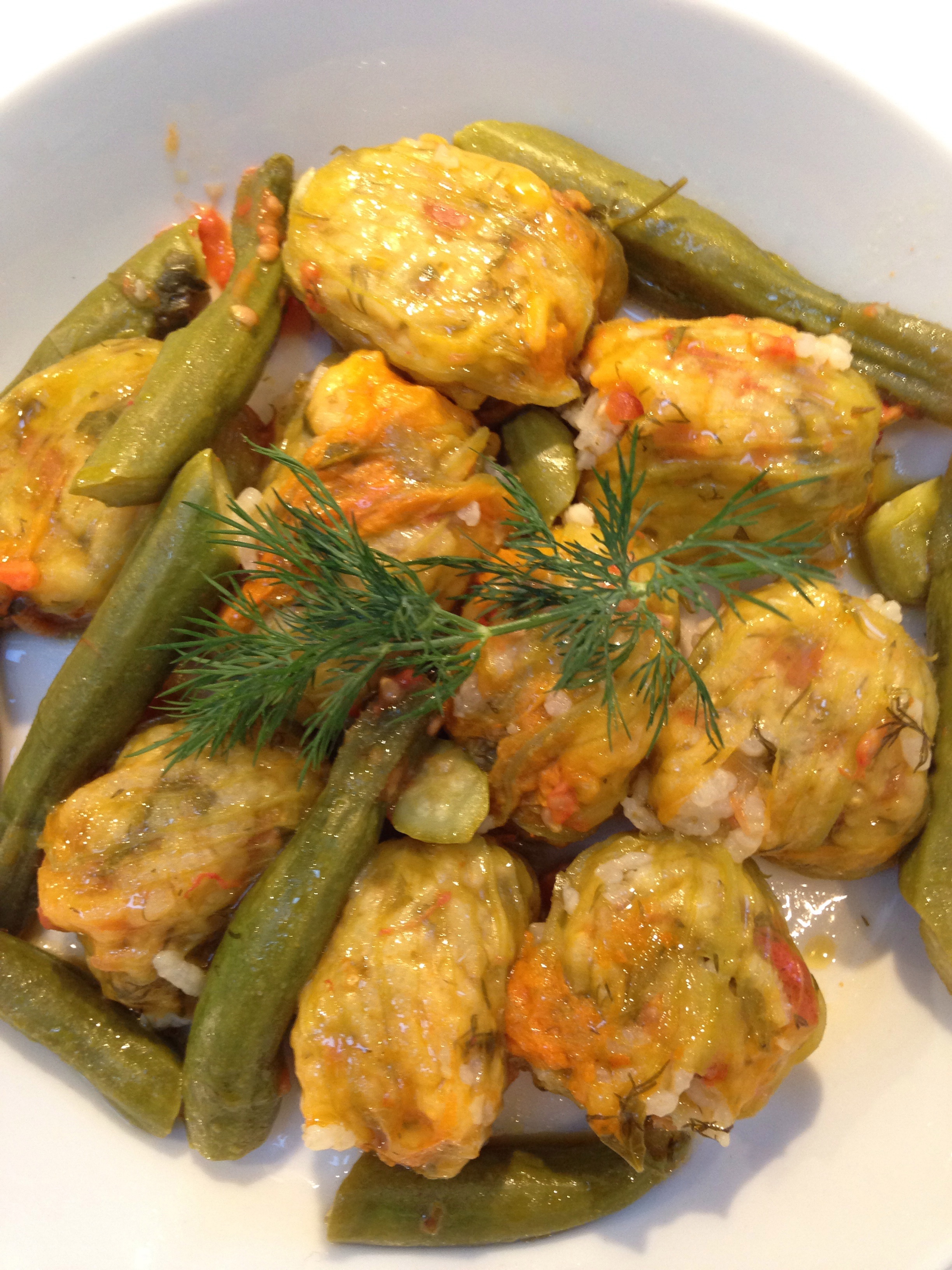 Now, take a courgette flower, put a small teaspoonful of the rice mixture into the heart of the flower and close the petals over. Some times, gently twisting the petals closed and tucking them under, works well.
