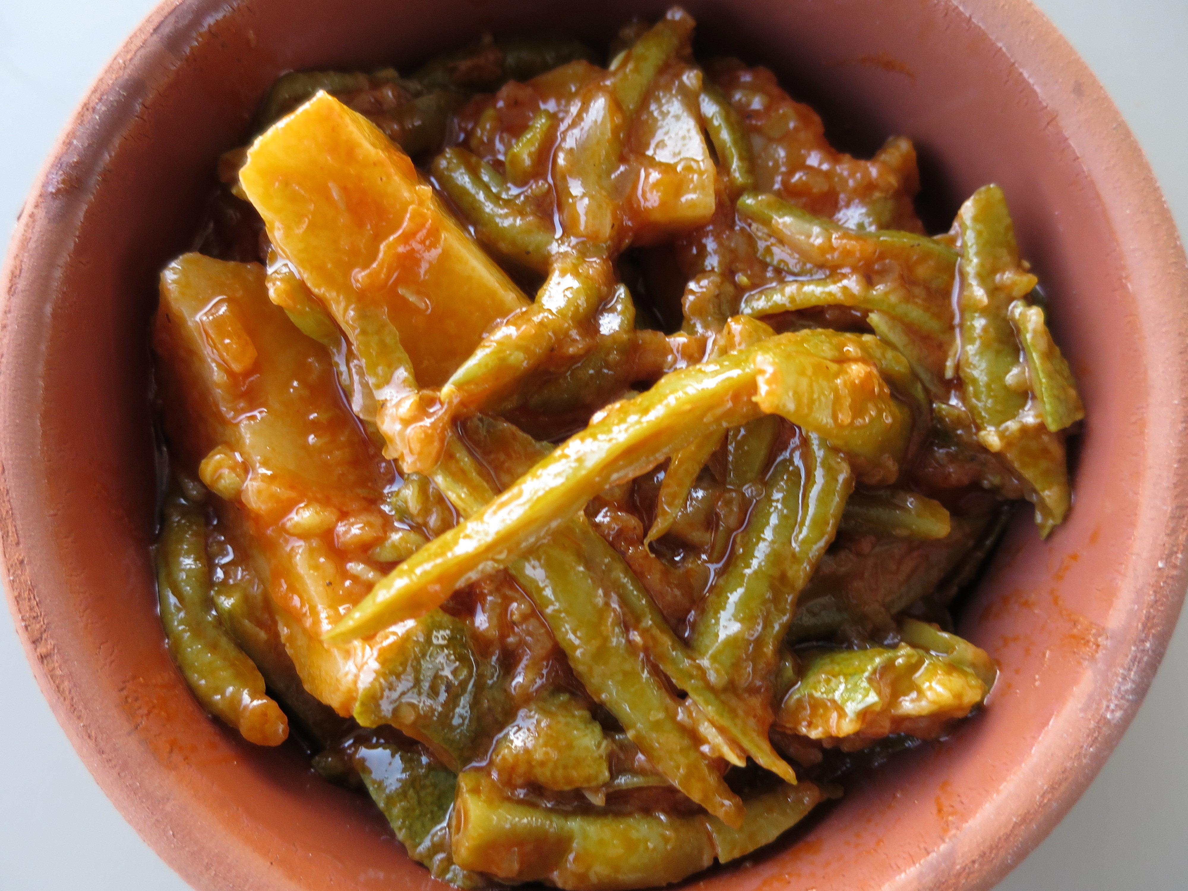 Now turn down the heat, so that you have a gentle simmer. Cover the pan with the lid and allow to simmer for about 35 minutes until the beans and potatoes are tender. You may need to add a little water during cooking – just not too much – the sauce needs to be rich and fairly thick.